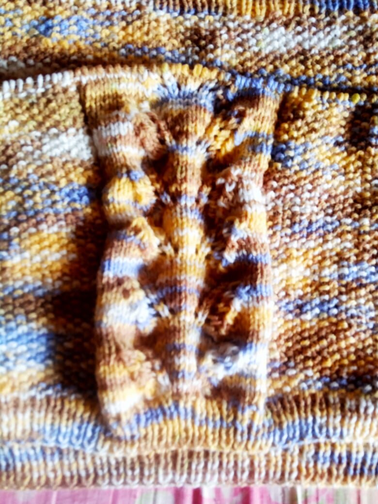 Начинаю вязать перед. Набрать 76 петель провязать резинкой 1Х1 8 рядов (2,5см). Далее в 1 ряду после резинки распределить петли. 25 п. жемчужный узор, 32 п. ажурный мотив, для него равномерно прибавить 6 петель, 25 п. жемчужный узор. Всего 82 петли. 1ряд- 25 п. жемчужный узор, 2 изн. 28 лиц. 2 изн. 25