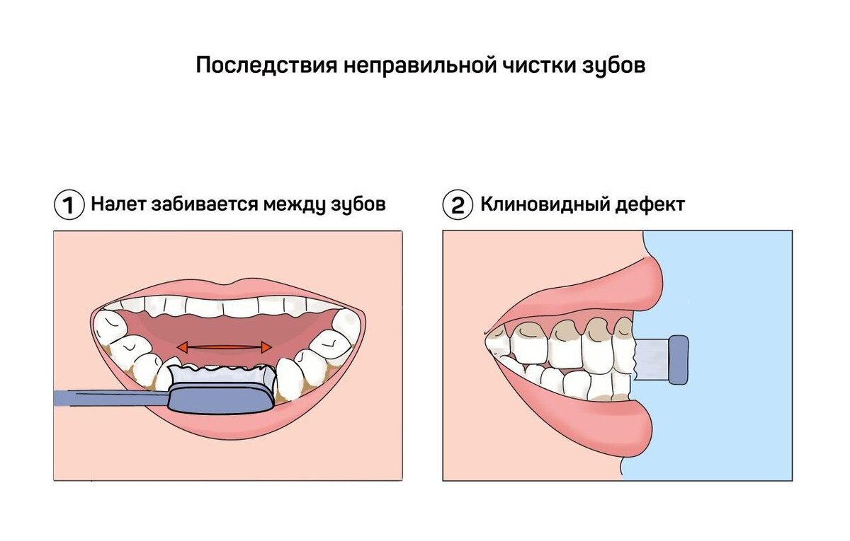 Сегодня обсудим очень, по-моему мнению, актуальную тему. Неправильная чистка зубов Давайте признаемся, зубы мы чистим на автомате. И делаем чаще всего это неправильно: чистим их движениями влево-вправо, быстро-быстро. При таком способе чистки мягкий налёт переносится с поверхности зубов в межзубные промежутки и забивается там. В итоге возникает опасность повреждения дёсен и появления клиновидного дефекта, особенно на выступающих зубах (чаще клыках). Немного о клиновидном дефекте: