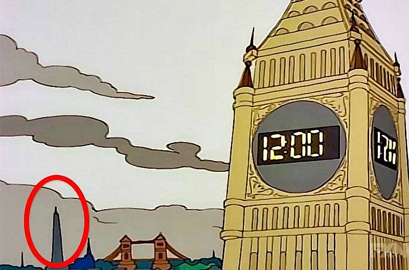Когда Лиза поехала в Лондон, за Тауэрским мостом показали здание, которое полностью совпадает по дизайну и расположению с реально появившимся небоскребом Осколок.Проект был разработан в 2000 году архитектором Ренцо Пиано. В 2007 началось его строительство, а в 2012 закончилось.