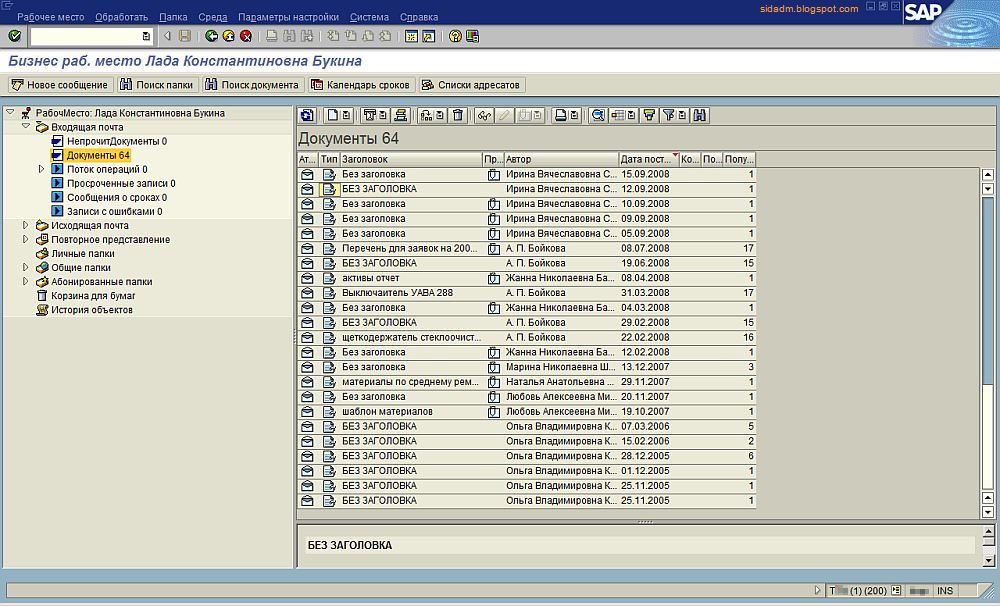 В любой версии ERP-системы SAP есть SAP Business Workplace (транзакция SBWP) или просто "Рабочее место SAP". Состоит оно из директорий (inbox, outbox) почтового ящика пользователя, календаря задач, личных папок с файлами и общих папок, доступных всем пользователям системы. Некий электронный органайзер. Пользователи часто используют возможности SAP-почты для обмена рабочей (и не только) корреспонденцией друг с другом.