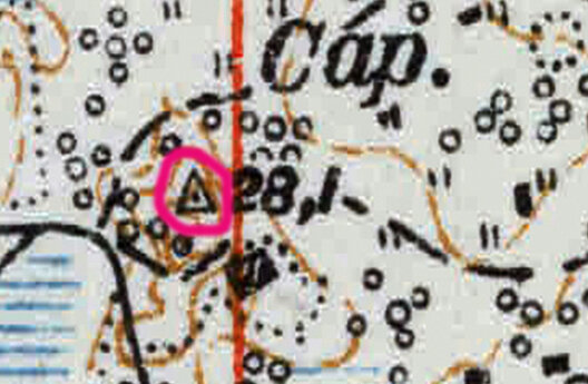 Ещё раз взглянули на карту и увидели топографический знак треугольник с точкой внутри. Это оказался геодезический знак. На карте он выглядит вот так.