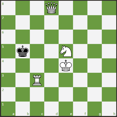 Предлагаю решить задачу автором которой является Полгар, 2001 год. Конь ладья и ферзь белых начинают и лихо ставят мат всего то в 2 хода.