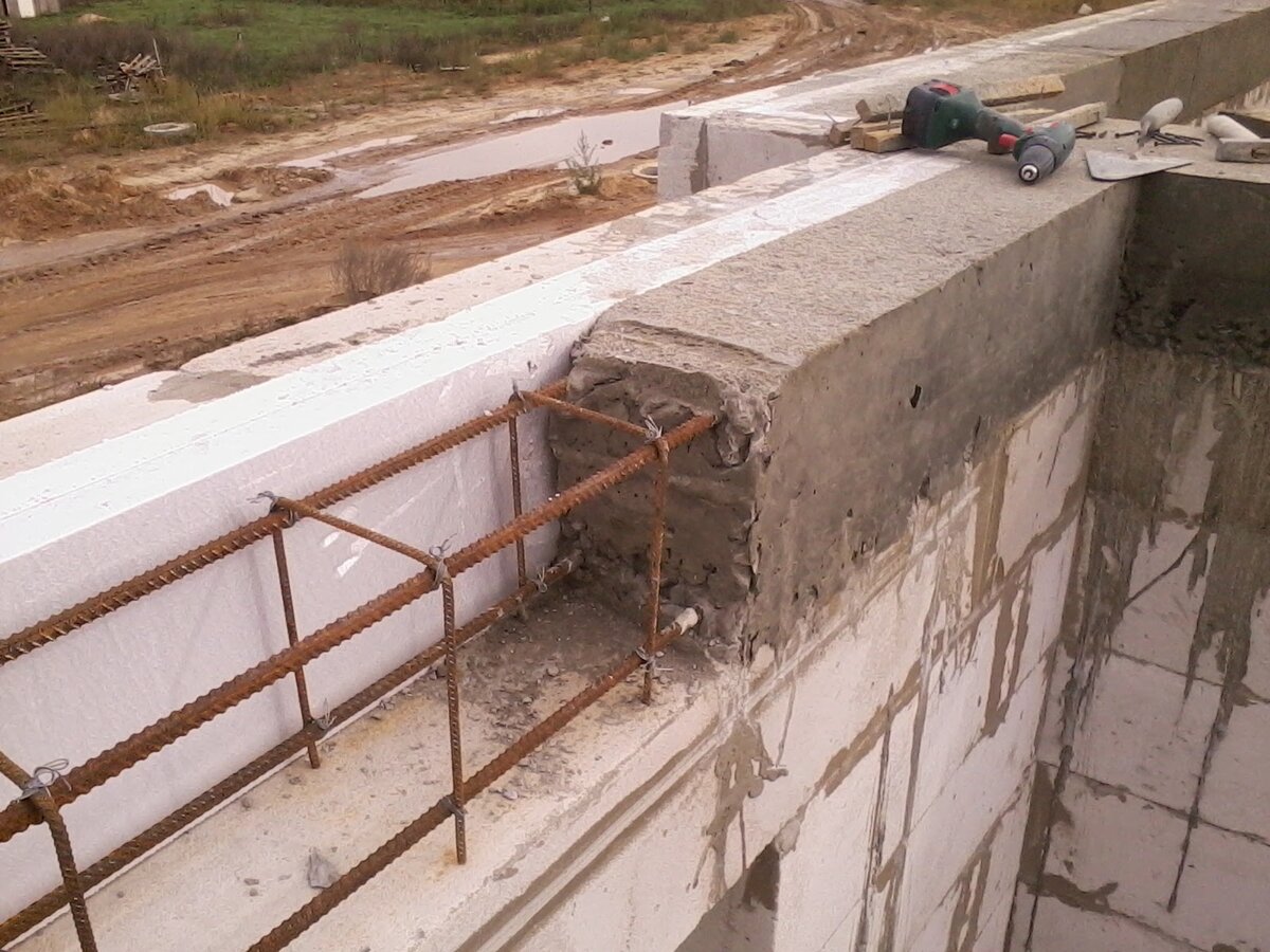 Результат заснял на следующий день. И он меня порадовал. Армопояс получился с ровной горизонтальной поверхностью. Не зря заглаживал и выводил его так долго. Потом на минеральный клей будут укладываться блоки (а не на раствор из-за неровностей). И плиты перекрытий будут ровнее лежать.