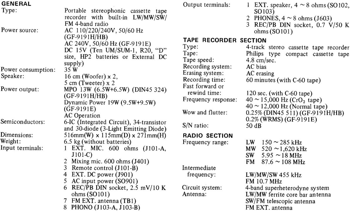 Sharp GF-9191 - простенькая, относительно топовой в этой серии Sharp GF-9696, но очень даже неплохо звучащая магнитола, которая выпускалась в 1978-1979 годах. Двухполосная акустика, с НЧ драйверами 16 см, позволяет ей как-то воспроизводить басовые составляющие музыки, несмотря на скромные габариты и вес магнитолы.