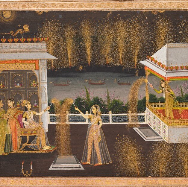 Дамы, празднующие Дивали. Около 1760. Дивали - фестиваль огней и самый важный индуистский праздник года. Его отмечали с древних времен, и история фестиваля, а также ритуалы отличаются от региона к региону. Самая распространенная легенда гласит, что Дивали отмечает триумф лорда Рамы над злым королем Раваной и последующее возвращение Рамы в королевство Айодхья после 14 лет пребывания в изгнании.