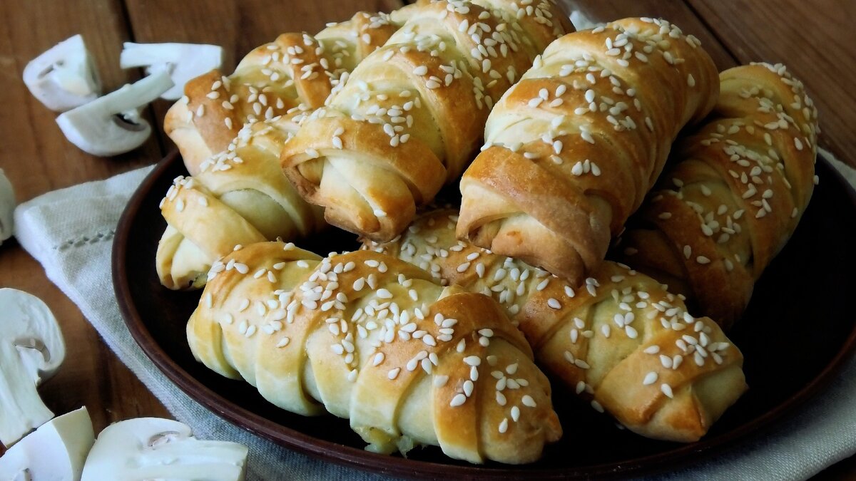 Всем привет! Сегодня предлагаю очень простой и вкусный рецепт прекрасных пирожков на кефире. Эти пирожки меня покорили своим невероятным тестом! Оно просто великолепное и на вкус и, особенно в работе! Интересная лепка пирогов делает их ещё аппетитнее и вкуснее. А начинку для них можно использовать любую, только не жидкую. От души рекомендую приготовить и попробовать! Ингредиенты: *Тесто* -200 мл кефира -1 желток -100 гр сливочного масла -330-350 гр муки -1/2 ч.л соли -10 гр разрыхлителя *Начинка* -картофельное пюре -150 гр шампиньонов -1 лук -соль/перец по вкусу -яйцо для смазывания -кунжут 1.Для теста в кефир добавить желток, соль и растопленное сливочное масло, перемешать. 2.Добавить муку и разрыхлитель, замесить мягкое и нелипкое тесто. 3.Накрыть тесто салфеткой и оставить на 20-30 минут. 4.Подготовить начинку. Нарезанные грибы обжарить на сильном огне с добавлением сливочного масла.В конце добавить соль и перец по вкусу. 5.Выложить мелко нарезанный лук и всё обжарить вместе. 6.Сое