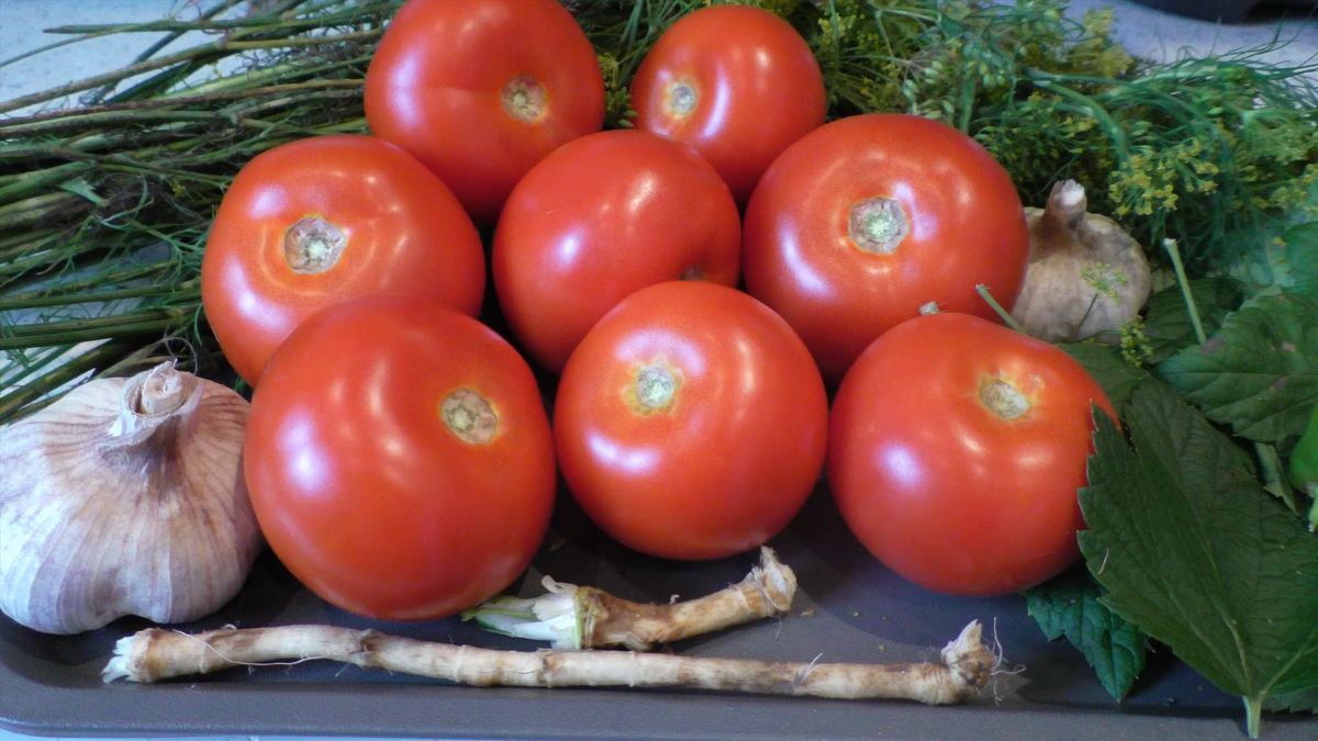 Нужно помидоры и конечно зелень . Из зелени беру укроп , чеснок , лист смородины , перчик чили и хрен .