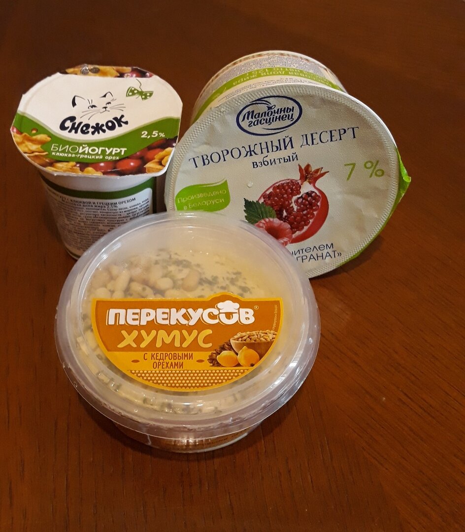 Я обожаю разные молочные продукты - йогурты, творожки и прочее. Сегодня в магазине купила попробовать новые вкусные десерты! Ещё йогурт, обычно несладкие творожки этой фирмы покупаю, качество хорошее! А ещё купила хумус, такой марки ни разу не пробовала, а вообще люблю хумус - нарезаю морковку, огурцы, болгарский перец и макаю. Можно хлебные палочки макать, крекеры, но я стараюсь сократить калорийность. Вот такие получились полезные вкусные перекусы.