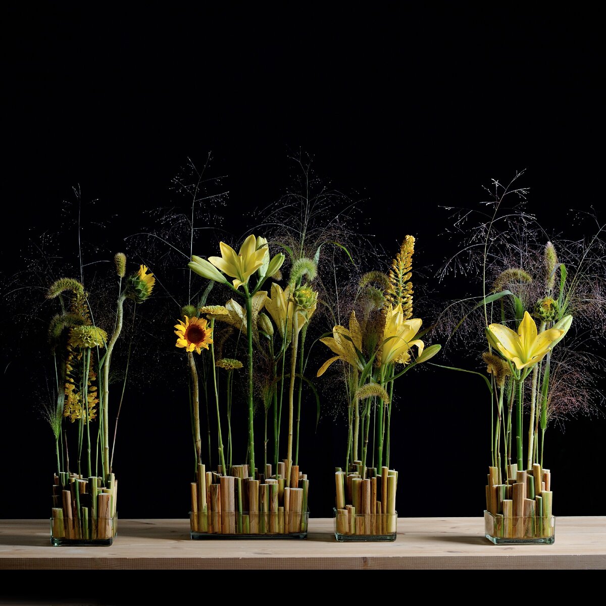 Задание первой группы состояло в том, чтобы создать из нескольких небольших композиций одно единое цельное оформление. Мы выбрали параллельную постановку материала в альтернативной технике без оазиса. Основой композиции был наш любимый рогоз, его нижняя часть. Солнечный, желтый цвет задавал летнее настроение нашему оформлению