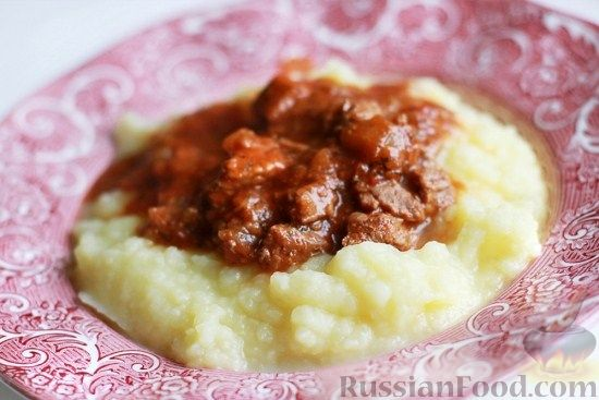 Гуляш — довольно распространённое блюдо, особенно гуляш с пюре. Наверняка, многие умеют его готовить. А для тех, кто не умеет, главное запомнить одно — не торопиться! И тогда всё получится. :) Продукты Мясо говядины (телятины) без костей — примерно 200 г Лук репчатый — 1 шт. Томатный соус (лечо НЕ острое, сальса или просто томатная паста) — примерно 200 мл Соль — по вкусу Мука — 1 ст. л. Вода Масло растительное Картофель — 5 шт. Сливочное масло — 50 г Соль — 1 ч. л. Молоко — 50 мл Правильно приготовленное мясо становится совсем мягким — это блюдо смогут есть даже те, у кого зубов ещё не слишком много. Нежное картофельное пюре и вот такое мягкое мясо с сочной ароматной подливкой — отличный вариант обеда! К тому же, готовить для ребёнка отдельно не придётся, это блюдо можно есть всей семьёй! Очень вкусно, правда! ;) Пошаговый фото рецепт Самое главное в этом блюде — это, конечно, мясо. Оно должно быть свежим! Это может быть как говядина, так и телятина. Смотрите на цвет, мясо не долж
