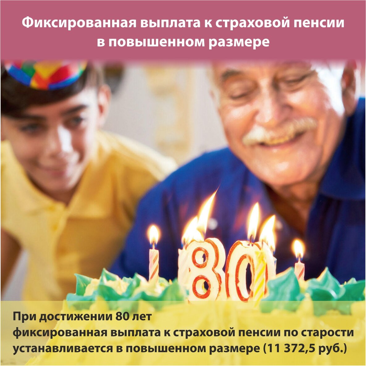Каждому юбиляру, получающему страховую пенсию, при достижении возраста 80 лет в автоматическом режиме устанавливается фиксированная выплата к пенсии в увеличенном размере. Исключение составляют инвалиды I группы, оформившие страховую пенсию до круглой даты (фиксированная выплата была установлена в увеличенном размере сразу при