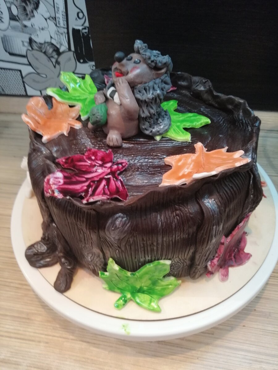 Я присыпала стол сахарной пудрой и раскатала тонко мастику тёмно- коричневого цвета, затем специальной формой придала мастике имитацию дерева