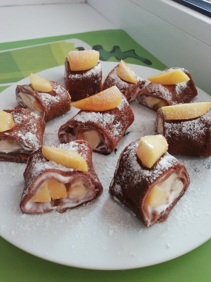 Привет всем! Сладкие роллы из блинчиков я попробовала впервые в ресторане. Это было безумно вкусно и дороговато за такую мизерную порцию. Но этот вкус не давал мне покоя... Что привело к домашнему приготовлению этого самого наивкуснейшего десерта. Съедаются сметаются эти роллы за один присест! Обязательно попробуйте удивить своих родных. Понравится всем без исключения! Итак, для блинчиков необходимо растереть яйцо с сахаром. Добавить молоко, щепотку соли. Затем добавляем какао-порошок и муку. Хорошо перемешиваем. Должно получиться жидкое тесто как на обычные блины. Пока остывают готовые блинчики займемся начинкой. Я использовала детский творог "Агуша" классический. Добавила сметану и сахарную пудру. Хорошо перемешать. Смазываем блинчик нашим кремом. Выкладываем фрукты по краю блина. Я готовила с бананом и нектаринами. Можно использовать киви, клубнику, груши или любые другие ваши любимые фрукты и ягоды. Сворачиваем блинчик в рулетик и разрезаем на кусочки. Украшаем ягодами или ку