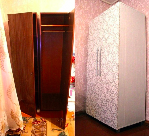 Помните, не так давно мы писали о способах переделки старой мебели? Применить их к устаревшему, но ещё крепкому шкафу – самый простой способ обновить интерьер. Вот, например, результат окраски и оклейки старого шкафа «под ремонт» – и спальня, и шкаф на фото «после» выглядят неузнаваемо!