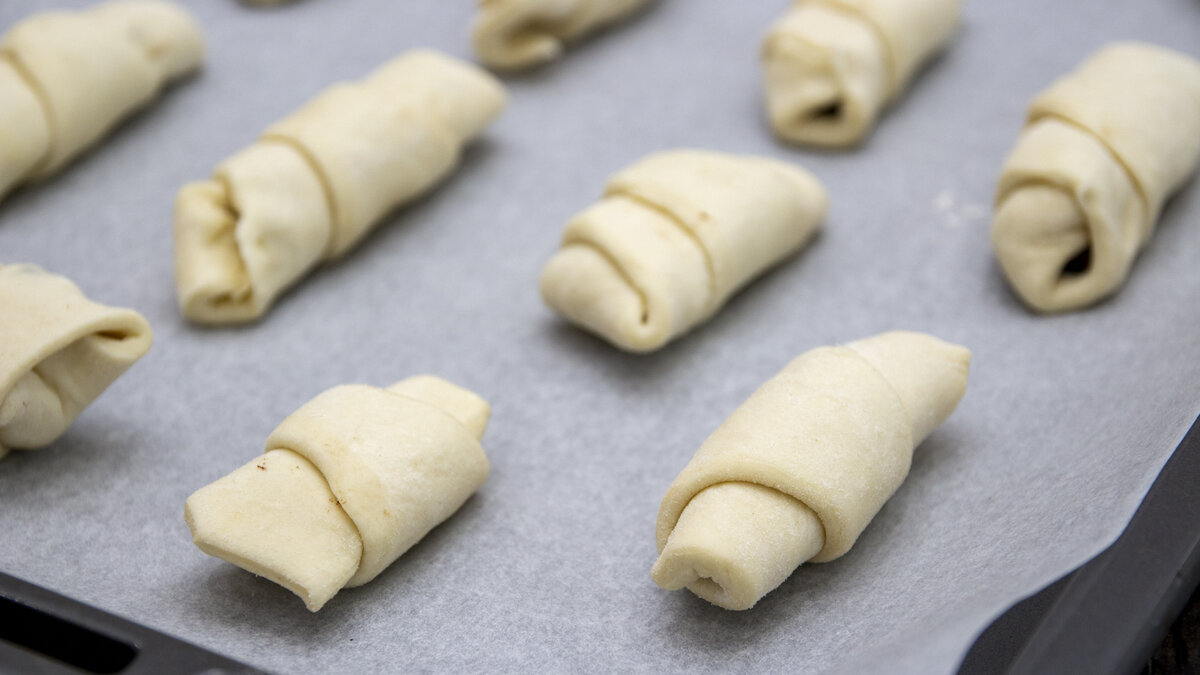 Круассаны выкладываем на противень, застеленный бумагой для выпечки, на определённом расстоянии друг от друга. Сверху смазываем их яйцом, чтобы они были румяные и золотистые.