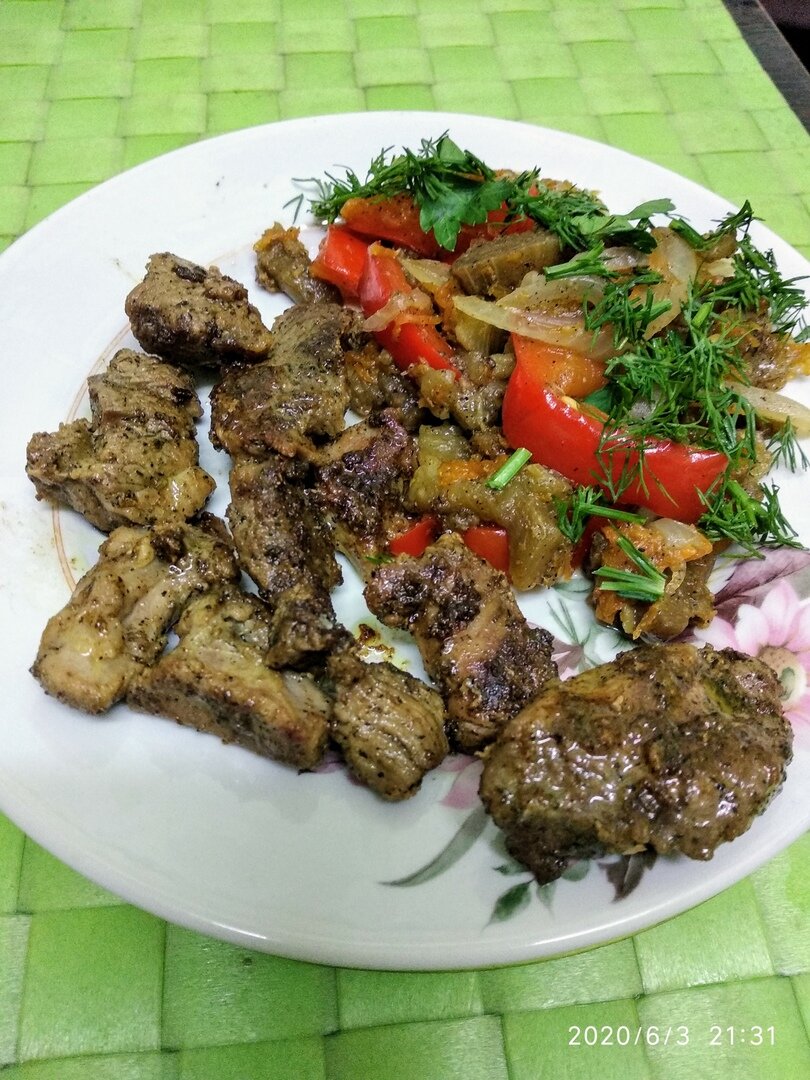 Баклажаны (у меня было 3 шт средних) очистила и нарезала на полукружочки. Морковь 2 шт на среднюю терку. Лук большая головка порезала полукольцами. Перец болгарский (я взяла красный) порезала. Соль, перец, чеснок сушеный по вкусу. Все овощи тушила на сковороде с кокосовым маслом. Посыпать рубленой зеленью.