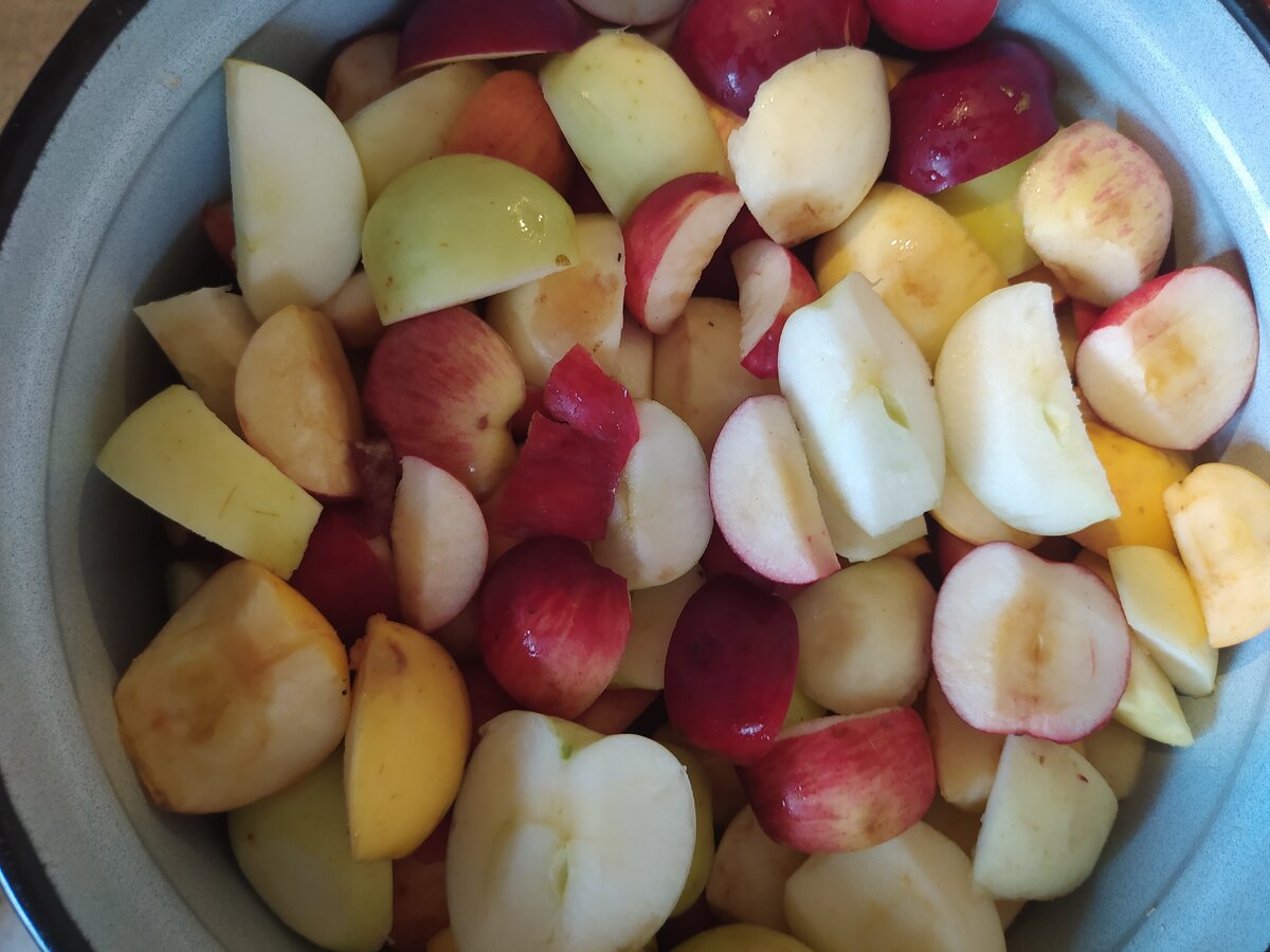 1 Промыть яблочки, нарезать на четвертинки, обрезать плохие места и серцевину. Положить в кастрюлю, добавить стакан воды, чтобы при варке не пригорели.