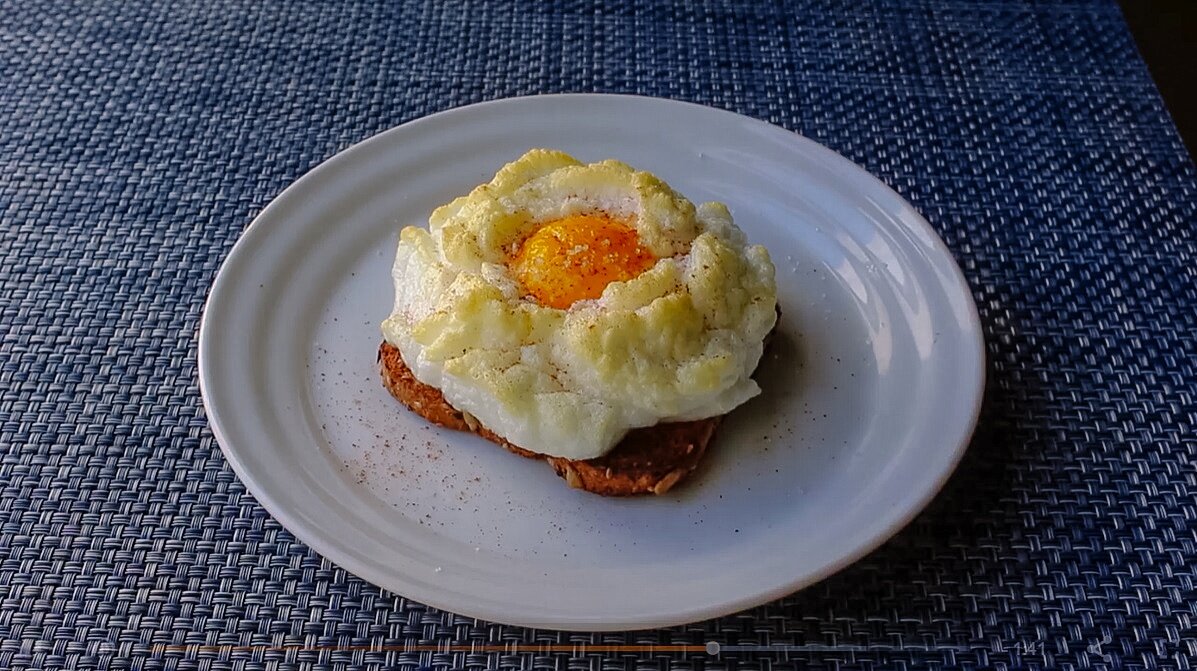 Хотите разнообразить эту воздушную яичницу - добавьте в белковую массу мелко рубленную зелень или подайте ее с жареным беконом. Будет очень красивый, вкусный и оригинальный завтрак.