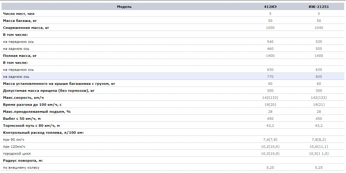 ДВИГАТЕЛЬ. Мод. 412Э и 412ДЭ, бензиновый, рядный, 4-цил., 82x70 мм, 1,48 л, порядок работы 1-3-4-2, карбюратор ДА-АЗ-2140. Мод.412Э и 412Ю: степень сжатия 8,5; мощность 54,0 кВт (73,5 л.с.) при 5800 об/мин; крутящий момент 105,8 Н*м (10,8 кгс*м) при 3000-3800 об/мин. Мод.412ДЭ и 412ДЮ: степень сжатия - 7,2; мощность 49,0 кВт (66,6 л.с.) при 5800 об/мин; крутящий момент 102,0 Н*м (10,4 кгс*м) при 3000-3800 об/мин. ТРАНСМИССИЯ. Сцепление - однодисковое, с диафрагменной пружиной, привод выключения - гидравлический. Коробка передач - 4-ступ., передат. числа: I-3,49; II-2,04; III-1,33; IV-1,00; ЗХ-3,39. Синхронизаторы - на I-IV передачах. Карданная передача - один карданный вал. Главная передача - гипоидная, передат. число - 3,91. КОЛЕСА И ШИНЫ. Колеса - дисковые 4 1/2J-13. Крепление - на 5 шпильках. Шины - 165/80R13 или 165-13 (6,45-13), мод. МИ-166, Я370 или М-145. Давление в передних шинах 1,7; задних - 2,0 кг/см. кв., Число колес 4 + 1. ПОДВЕСКА. Передняя - независимая, на поперечных