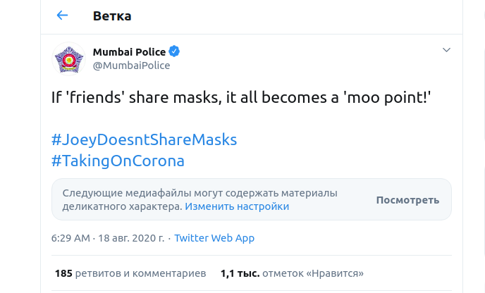 В официальном твиттере полицейской службы этого индийского города (там сейчас все сложно с коронавирусом) попросили не давать свою маску друзьям. А кто у нас не делится, даже с друзьями? Вот-вот.