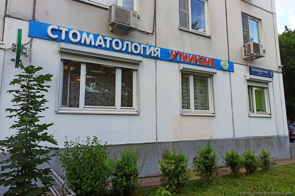 Еще одна забавная вывеска: стоматология "Уткин зуб". Обратите внимание на адрес: Высоковольтный проезд. Рядом электрическая подстанция 500 кВ и испытательный центр высоковольтной аппаратуры. Посреди всего этого строится жилой комплекс "Римского-Корсакова 11", про него я упоминала здесь. А вокруг сплошные гаражно-строительные кооперативы.