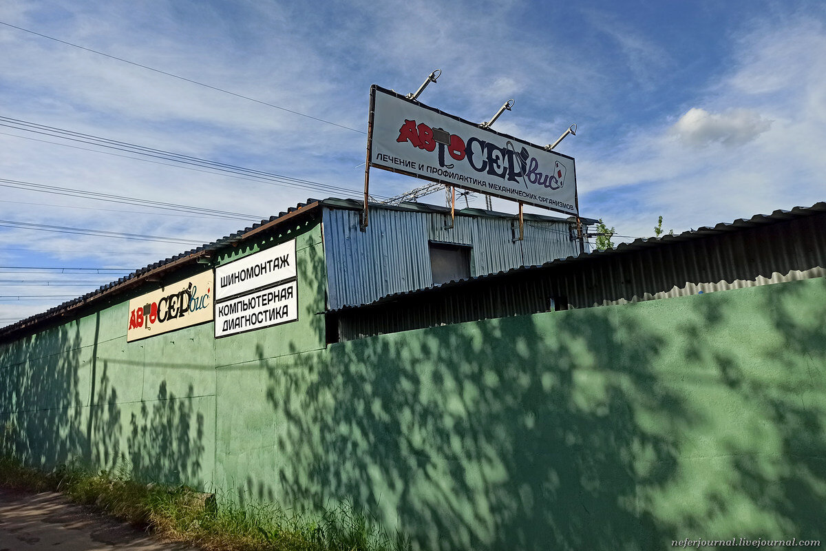 Ездили на велосипедах, периодически останавливалась, чтобы сделать фото. По пути попалась промзона с заводами и производственными базами, плавно переходящая в гаражи, их там тысячи. Увидела вот такую надпись: лечение и профилактика механических организмов :)