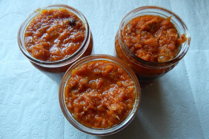 Рыбу почистить, выпотрошить и отварить без головы. Овощи помыть, лук мелко нарезать и обжарить в 30 мл. масла, в обжаренный лук добавить натертую морковь. Когда морковь станет мягкой добавляем отчищенные и мелко порезанные помидоры. Все это тушить 30 минут периодически помешивая, во время тушения добавляем перец и красный и черный (красный перец почистить от косточек и мелко нарезать), так же добавляем чеснок давленный на чеснокодавилке, сахар добавляем 2 столовых ложки соль 1.5 столовых ложки. Свеклу натертую на крупной терке обжариваем в отдельной сковороде с оставшемся маслом, туда добавляем 1 столовую ложку сахара , 1 столовую ложку соли и вливаем уксус, процес обжаривания займет около 20-25 минут. После того как рыба сварилась тщательно отделите ее от костей и порвите руками на небольшие кусочки. Когда все подготовили то смешиваем в отдельной кастрюле и тушим все примерно 40-45 минут. Рецепт рассчитан на 20-22 поллитровые банки. Когда все потушили раскладываем по баночкам и укутываем их на сутки, после этого можно употреблять.