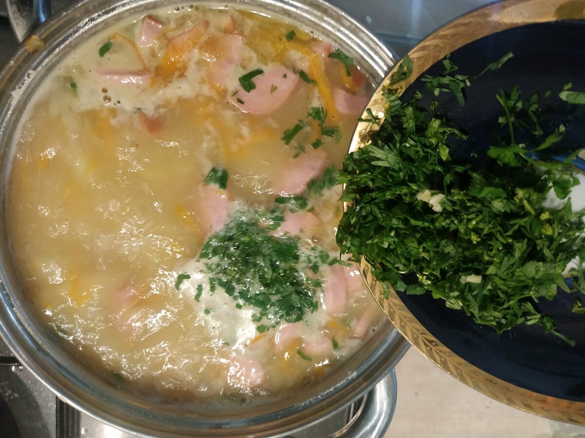 Добавляем пассировку с сосисками в кастрюлю и варим ещë 3 минуты.