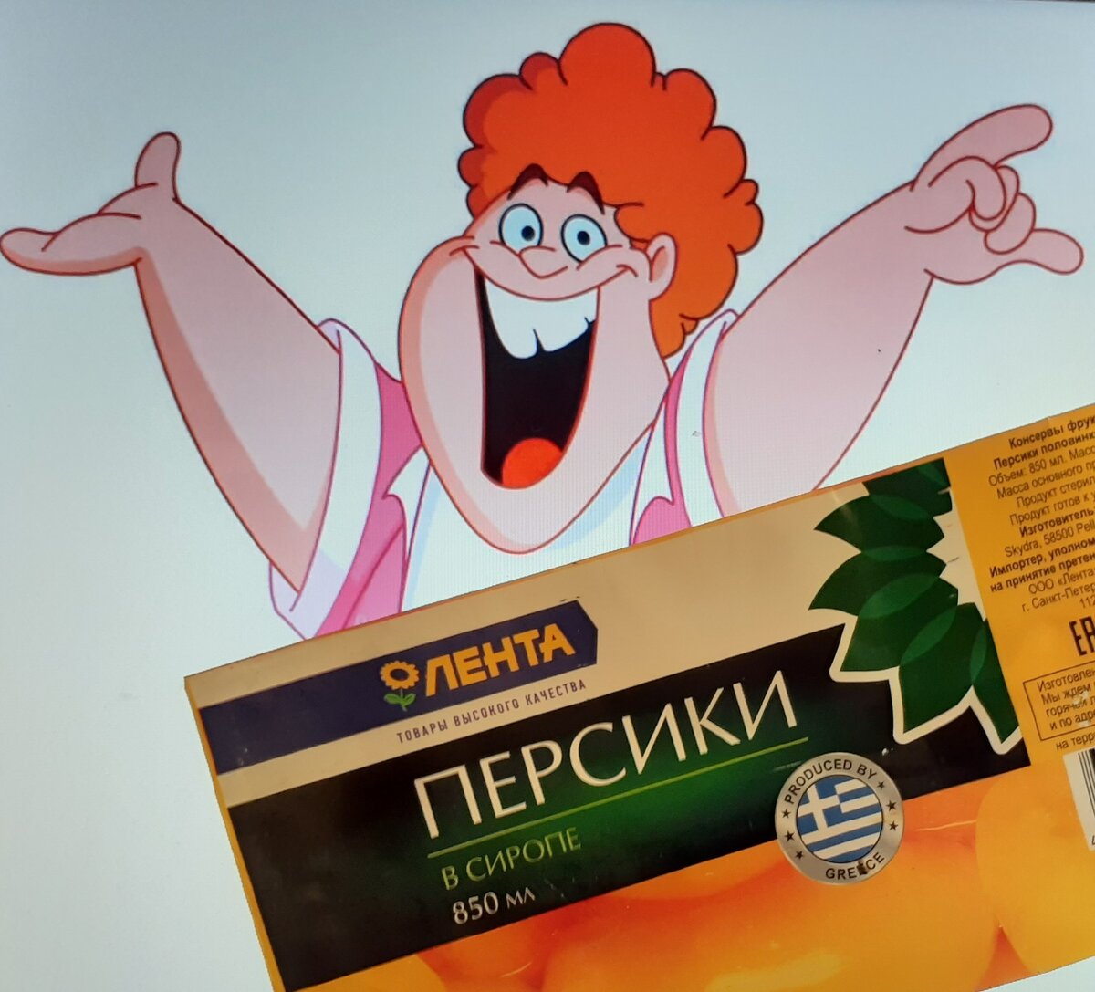 Персики их Греции. Цена за банку в 850 мл. – 129 рублей.