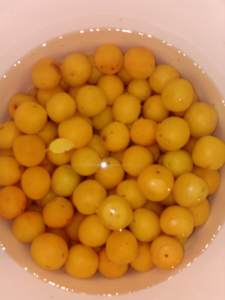 Везет мне в этом году на алычу. То целое ведро красной подарят, то у родителей желтая впервые за много лет приличный урожай дала. Как же из нее что-нибудь не приготовить? Тем более, что в интернете такие красивые фотографии варенья из целых желтеньких ягод. Ну я решилась. Правда ягодки у меня не очень красивые, когда зеленые еще были - градом побило и рубцы от ранок остались. Но на вкус это не влияет. Ягоды я промыла, отобрала ну уж совсем страшненькие и взвесила. Вышло чуть больше полутора килограммов. Затем в каждой ягодке сделала по несколько проколов. Быстрее и удобнее всего вилкой получается. Переложила в кастрюлю, влила 2 стакана воды (в следующий раз один буду) поставила на небольшой огонь и потихоньку всыпала 3 пол литровых банки сахара. Пока ягоды были еще твердые, аккуратно помешивала, чтоб сахар лучше растворился. После закипания проварила мнут 10 выключила. Через некоторое время второй раз поставила на огонь на 10 минут и выключила. После третьего раза разложила ягод