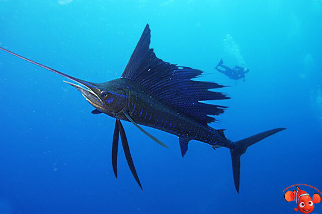 Рыба-парусник является непревзойденным по скорости обитателем морских глубин. Это удивительное создание обитает в теплых экваториальных водах Тихого и Индийского океанов, изредка встречается в Красном, Средиземном и Черном морях. В Тихом океане встречается разновидность — Istiophorus albicans, развивающая скорость до 100 километров в час, а в Индийском Istiophorus platypterus. Полюбоваться этим гепардом подводного мира, вы сможете, просмотрев фото рыба-парусник. Но прежде пару слов о том, почему этот представитель лучеперых рыб получил такое своеобразное название. Все дело в первом спинном плавнике, огромного размера голубого цвета с мелкими темными пятнышками, начинающемуся на затылке, и проходящему вдоль всей спины, который очень похож на парус. Все остальные плавники — темно-коричневого и черного цвета с голубыми полосками. Эти детали хорошо видны на ниже представленных фотографиях. Взрослые парусники могут достигать веса 100 килограмм и длины до 3,5 метров. Их столь быстрое перемещ