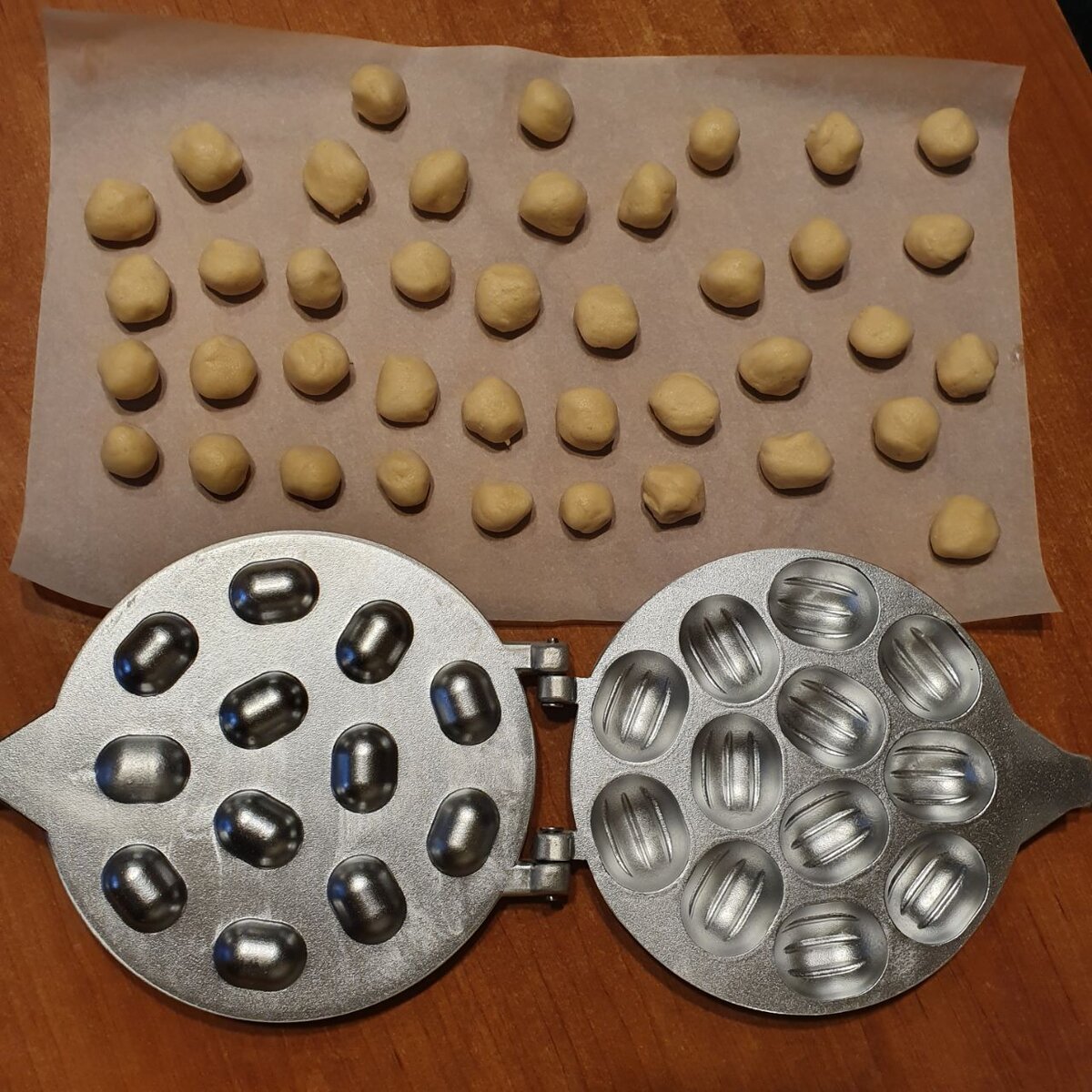 Форму-сковородку смазать небольшим количеством растительного масла, нагреть с двух сторон. Тесто достать из холодильника и скатать из него маленькие шарики (как на фото), мне так удобнее, можете просто выкладывать его на сковороду ложкой. Поместить в каждое гнездо по шарику, форму закрыть, крепко сжать ручки и поместить на плиту. Важно! Держите крепко ручки "орешницы" первые секунды, чтобы тесто схватилось. Выпекать до румяного состояния, потом перевернуть и выпекать с другой стороны. Форму снять огня, выложить половинки будущих орешков, дать им остыть. Приступить к следующей партии, пока не закончится тесто.