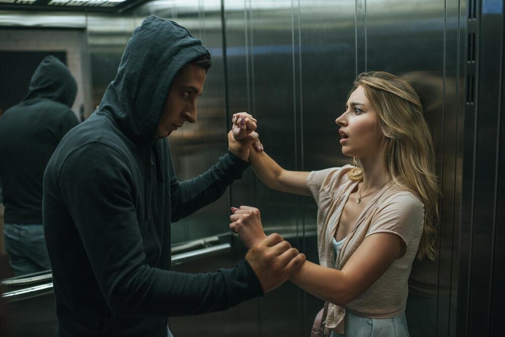 Конфликт в лифт — что может в нем произойти? Вас догоняют, вы убегаете и запрыгиваете в лифт, злодей рвется за вами. Самый простой способ управиться с ним, это оглушить противника встречным ударом, одновременно выкидывая его из кабины. Посоветую так называемый штурмовой удар, бьется он двумя руками в голову, не целясь, в том-то и прелесть. Руки должны быть плотно прижаты к корпусу, во-первых, чтобы не выдавать своих намерений, а во вторых, удар получается жестче, если локти не растопыривать. Я называю эту технику «удары из кармана». К вам в кабину неожиданно заходит подозрительный попутчик, вы поворачиваетесь к нему лицом и едете на последний этаж. Самое главное — не оказаться спиной к незнакомцу. Если он не выходит и настаивает на том, что должны выйти вы, выходите — почему нет, но лицом к нему, и вполоборота идите на свой этаж, как бы по-идиотски это ни выглядело. И не бойтесь оскорбить человека явным недоверием. Негативные люди очень заметны — не перепутаете, не волнуйтесь. Если
