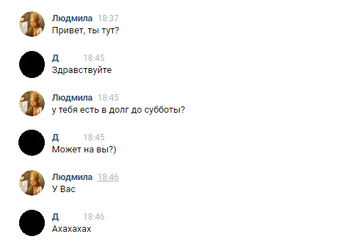 Буквально несколько дней назад мой аккаунт в популярной сети «ВКонтакте» был взломан. Те, кто это сделали, тут же разослали моим друзьям (а их у меня больше 800 человек) сообщения-приветы. Это первое сообщение обычно пишут с маленькой буквы, его цель узнать, находится ли человек в сети. Дальше идет просьба одолжить денег до субботы, номер карты, куда сбрасывать средства и обещание отдать долг. В данной социальной сети я дружу со близкими мне людьми, однокурсниками, коллегами по работе, студентами, а также с людьми «по интересам». Почти со всеми я на «Вы». Поэтому сразу сообщение на «ты» насторожило. Как, например, мою коллегу: Мои студенты, увидев сообщение и догадавшись, что это не я, сразу стали задавать уточняющие вопросы. Порадовал своим чувством юмора один мой виртуальный друг (даже не помню, где мы с ним пересекались): Также профессиональное чувство юмора продемонстрировал знакомый журналист. И еще один мой «контактер». Некоторые просто вежливо отказывали в просьбе о