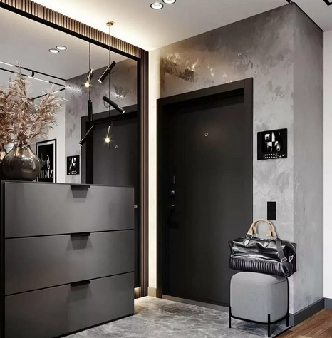 Окраска прихожей в темный оттенок серого цвета сделает стены ярче и больше. Старайтесь избегать слишком темных тонов в коридоре, выходящем на север. Темные оттенки идеально подойдут только в том случае, если нужно уменьшить яркость пространства, обращенного на юг. Попробуйте создать смелый контраст с всплеском насыщенного желтого, оранжевого или розового цвета, чтобы он совпал с темно-серым.