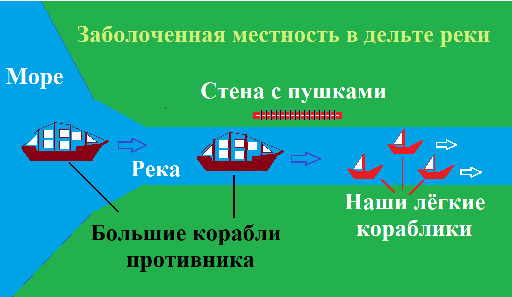 Наши лёгкие суда дразнят большие корабли противника и когда он начинает погоню, удирают в дельту реки.