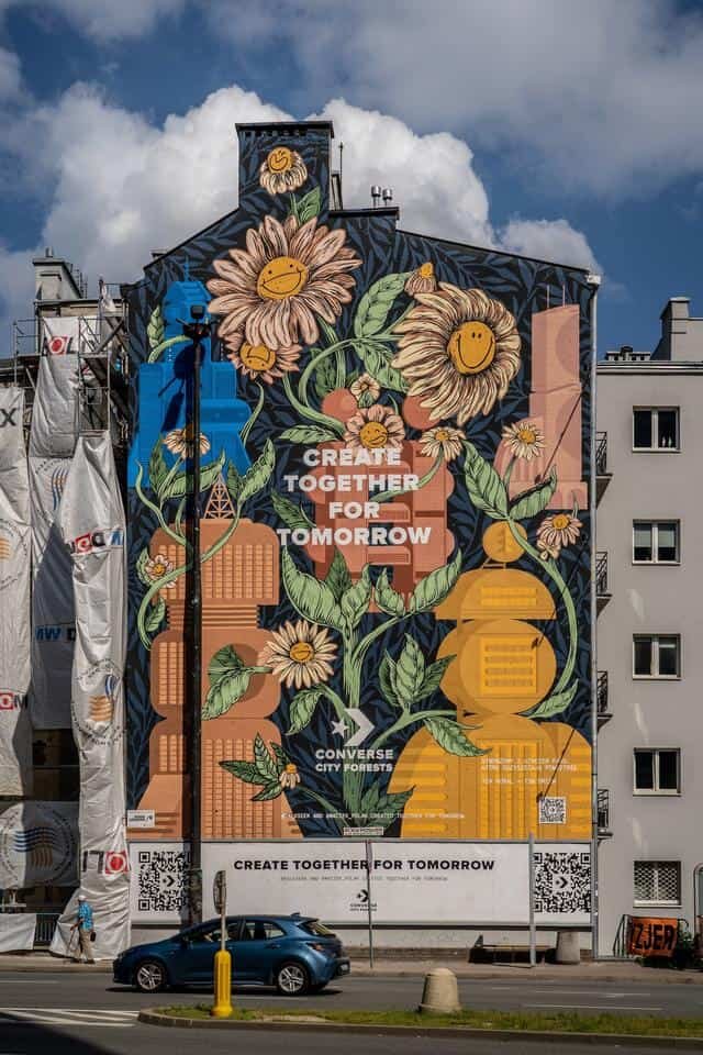 В рамках акции “City Forests” марка Converse решила совместить приятное с полезным и создала в Варшаве новый мурал, который не только хорошо выглядит, но и очищает воздух вокруг! Варшава стала одним из 14 городов мира, в котором появился подобный экологичный мурал. Как это работает? Так называемые Converse City Forests это серия муралов, при создании которых используется каталитическая краска, которая помагает очищать воздух. Эта технология использует световую энергию чтобы разлагать вредные субстанции в воздухе и превращать их в безвредные. Любая поверхность, покрытая такой краской, становится активным очистителем воздуха, который помогает снизить воздействие вредных газов на людей и животных. Художники В Варшаве создателями проекта являются Maciek Polak и Dawid Ryski. Дэвид Рыски – ландшафтный архитектор по образованию, на данный момент работает иллюстратором. Сейчас он проживает в городе Пулавы. “В моем воображаемом городе будущего все билборды исчезнут, а все водители автомобиле