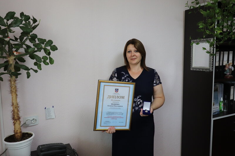 К сожалению, в силу сложившейся ситуации с коронавирусной обстановкой в области награждение было отложено, но, как говорится, награда нашла своего героя. Диплом за 3 место в конкурсе и медаль начальнику финансового отдела Администрации Волгодонского района Н.Н. Фёдоровой вручил и тепло поздравил глава Администрации Волгодонского района С.В. Бурлака. Коллеги и друзья искренне пожелали Наталье Николаевне дальнейших успехов и побед.