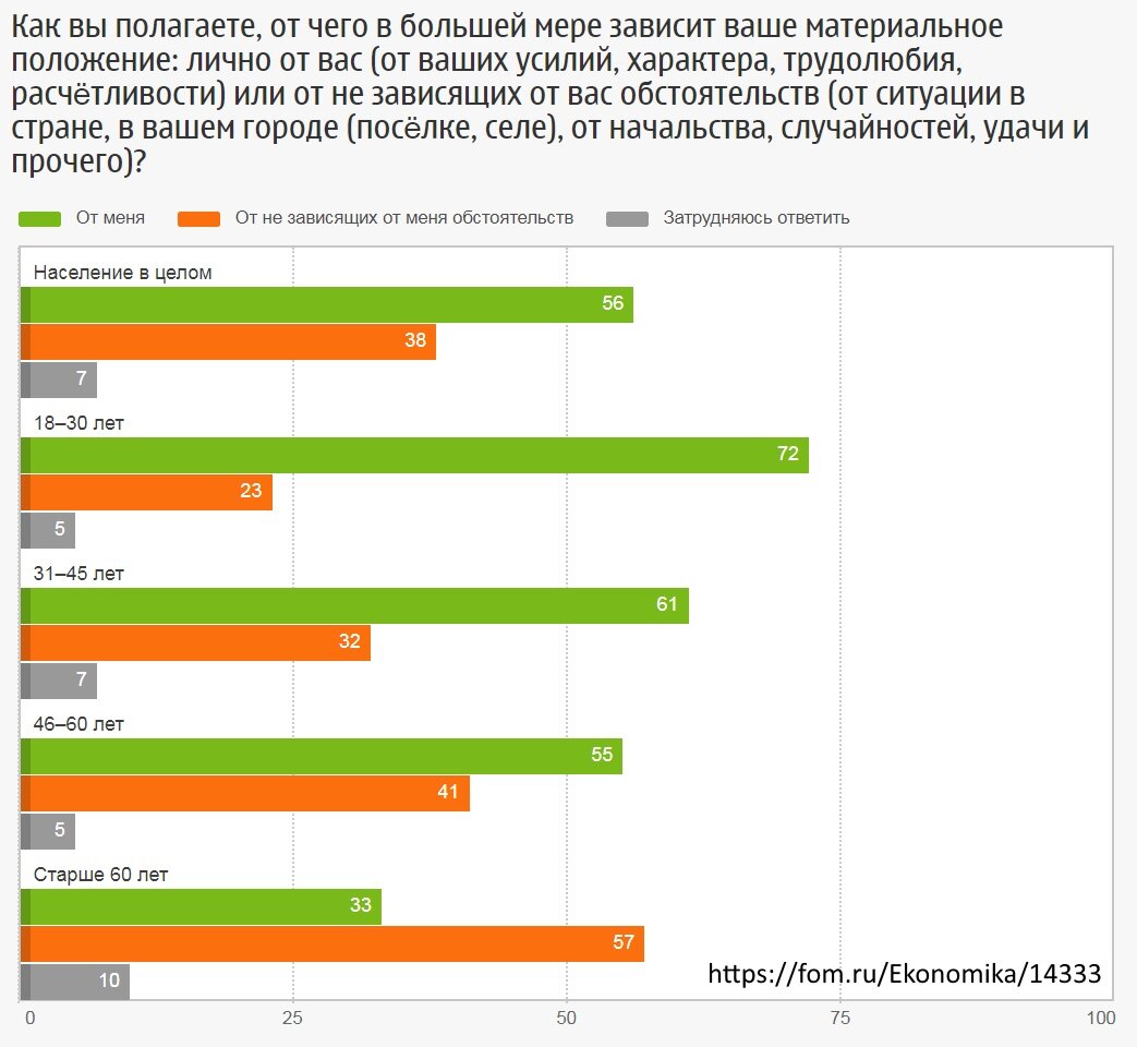 Предположу, что причину возрастных различий стоит искать в нашей истории. Советская идеология считала прямую увязку между трудом и личным достатком постыдным мещанством. Богатых официально считали жуликами и людьми второго сорта, со школьных лет советских граждан учили выкладываться не ради построения коммунизма в отдельно взятой квартире, а ради коллектива, ради общего блага.