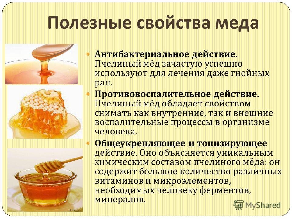 . Содержит питательные вещества Мёд примерно на 80% состоит из сахаров, на 18% — из воды. Точный объём жидкости определяется видом пчёл и растений, а также степенью промышленной обработки. Калорийность мёда достаточно высока – около 304 калории на 100 граммов. Мёд практически не содержит пищевых волокон, белков (только некоторые незаменимые аминокислоты) и жиров. В нём имеется небольшое количество железа, йода, кобальта, меди, фтора, цинка, калия, кальция, фосфора, магния и некоторых витаминов группы B, C, PP. Учёные отмечают, что главное достоинство мёда – обилие антиоксидантов и прочих растительных соединений. При этом, чем темнее сорт – тем их выше. Мёд богат растительными соединениям, особенно – антиоксидантами. 2. Обладает антиоксидантным эффектом Как утверждают учёные из США, качественный мёд насыщен ценными антиоксидантами: органическими кислотами и фенольными соединениями (флавоноидами). Также он содержит полезные аминокислоты и ферменты, выделяемые пчёлами. Совокупность описанных компонентов делает мёд невероятно мощным антиоксидантом. Исследования показывают, что наибольшее количество антиоксидантных веществ содержится в гречишном мёде. Антиоксиданты защищают все клетки организма от воздействия свободных радикалов (образующихся в ходе окислительного стресса). Именно данные агрессивные молекулы играют важную роль в развитии злокачественных опухолей и некоторых хронических заболеваний (сахарный диабет II типа, болезнь Крона и др.). Антиоксиданты могут снизить вероятность развития возрастных заболеваний органов зрения, а также уменьшить риск инфаркта миокарда и инсульта. Подобные данные приводят специалисты из Малайзии. Мёд обладает выраженной антиоксидантной активностью. Он может использоваться для профилактики рака и множества хронических патологий. 3. Снижает артериальное давление Работники национального университета Малайзии установили, что растительные соединения в составе мёда обладают способностью расширять мелкие и крупные артериальные сосуды, в том числе – коронарные. Подобная особенность позволяет использовать мёд для снижения уровня артериального давления и увеличения притока крови к сердечной мышце, что особенно важно при течении ишемической болезни сердца (снижается частота и выраженность приступов). Схожие данные демонстрируют эксперименты на крысах. У всех грызунов в ходе опытов снижалось артериальное давление, подавлялся окислительный стресс. Высокий уровень артериального давления является значимым сердечно-сосудистым фактором риска и может способствовать развитию инсультов, хронической и острой сердечной недостаточности. Мёд рекомендуется принимать, как мужчинам, так и женщинам, для предупреждения грозных осложнений со стороны сердца и сосудов (при отсутствии нарушений углеводного обмена, например, сахарного диабета). Мёд способен снизить артериальное давление и предотвратить грозные осложнения гипертонической болезни. 4. Снижает уровень холестерина Высокий уровень общего холестерина, а также его атерогенных фракций – ЛПНП и ТАГ, является важным фактором риска развития атеросклероза и таких заболеваний, как ишемическая болезнь сердца, инфаркт миокарда, инсульт. Сосудистые катастрофы случаются, когда просвет артерий полностью перекрывается атеросклеротическими бляшка