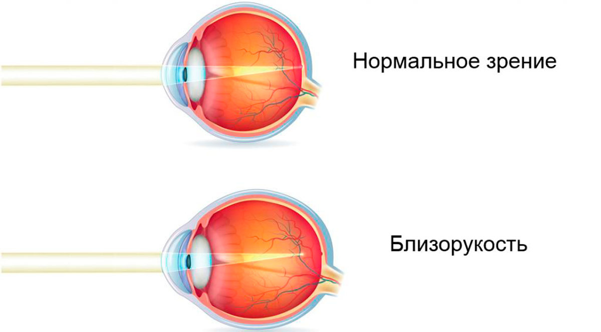 Этот дефект заключается в том, что из-за аномалии рефракции изображение фокусируется не на сетчатки глаза (физиологическая норма), а перед ней.