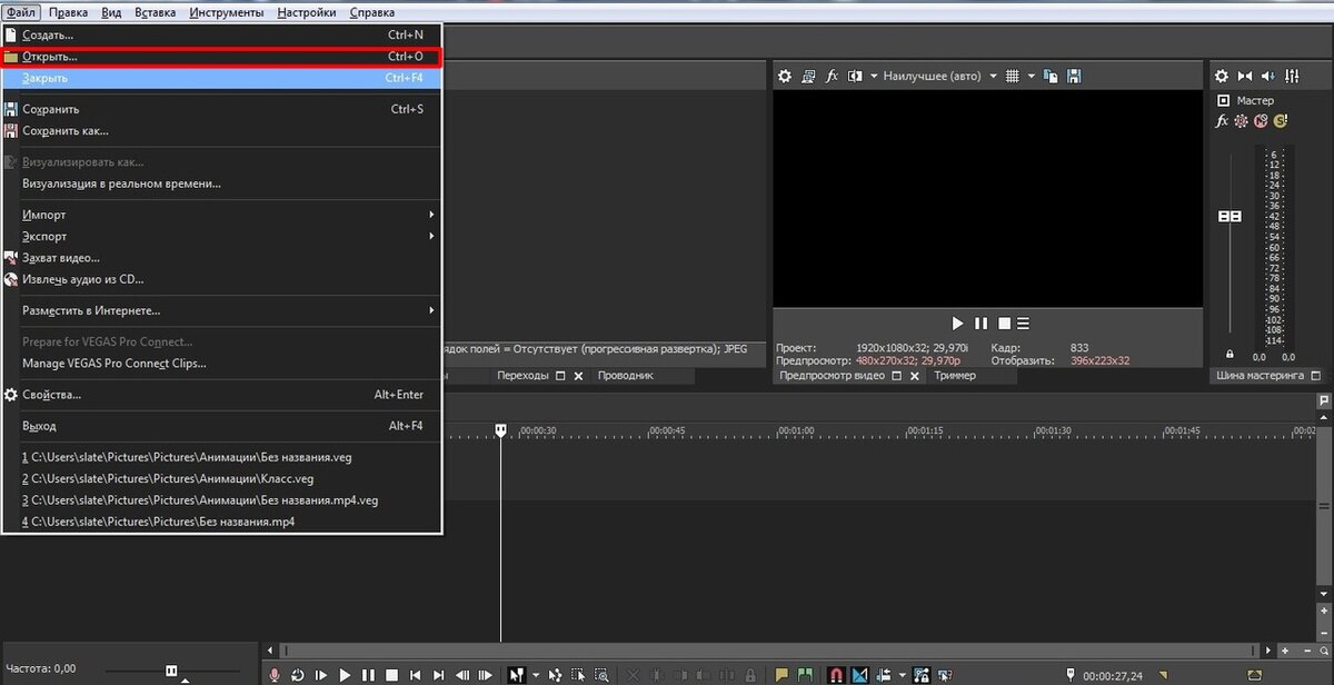 Как только вы зашли в приложение, вставьте фотографию в Sony Vegas. Это можно сделать несколькими способами: 1- Просто перенести фотографию. 2- Навести на "файл", нажать "Открыть", выбрать нужную фотографию, или картинку, и снова нажать на "Открыть"
