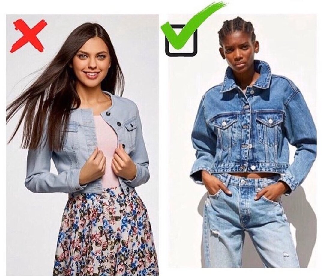 Чтобы отличить устаревшую джинсовку от актуальной, обратите внимание на ее объем. Если куртка сидит тесно, сковывает движения и вот-вот лопнет по швам - это плохая куртка, лучше от нее избавиться. Современная джинсовка вполне может быть укороченной, но в плечах и в груди она должна сидеть свободно и не обтягивать в рукавах.