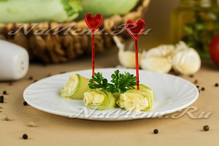 Ингредиенты: - кабачок среднего размера, с тонкой кожицей – 1 шт.; - сыр твердый (любого сорта) – 150 г; - чеснок – 2 зубка; - сметана – 1-1,5 ст. л.; - перец черный молотый – по вкусу; - соль – по необходимости. 🔪Нарезаем кабачки тонкими, почти прозрачными длинными полосками 💦Наберите в кастрюлю чистой воды. Доведите ее до кипения. Опустите кабачки на 3 минуты. Выньте. Остудите 🧀На крупной или средней терке натрите твердый сыр 🧄Добавьте к сыру пропущенный через пресс чеснок и сметану, можно добавить немного соли и черного молотого перца. Перемешайте 🥄Выложите начинку на кабачковую полоску. Слишком много начинки не кладите, иначе она будет вываливаться ✔️Сверните аккуратным рулетом, нанизывая вплотную друг к другу на длинную деревянную палочку (шпажку) 🔥Разогрейте духовку до 180 градусов. Выпекайте рулетики 20 минут https://namenu.ru/5482/Ruletiki_iz_kabachkov_s_syrom_i_chesnokom/