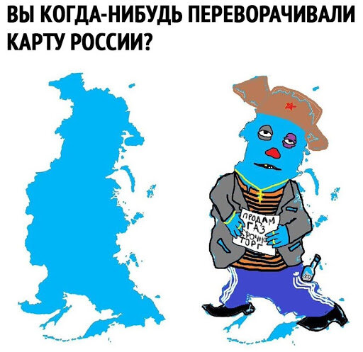 Здесь какие-то люди перевернули карту России и немного по шаблону подрисовали типичного алкаша, который есть в каждом дворе. Только наверное перевёрнутая Россия отличается от обычного алкаша тем, что Россия продаёт газ и другие природные ресурсы