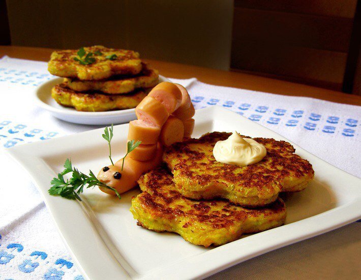 Время приготовления - 30 мин ИНГРЕДИЕНТЫ: Кабачок — 300 гр Морковь — 100 гр Сыр твердый — 70 гр Мука пшеничная — 110 гр Молоко — 50 мл Яйцо куриное — 1 шт Сода гашеная уксусом Соль (при необходимости) — по вкусу Перец белый (по желанию) — по вкусу Зелень (по желанию) — по вкусу СПОСОБ ПРИГОТОВЛЕНИЯ: Натереть морковь на крупной терке и слегка обжарить на растительном масле. Тем временем натираем кабачок и твердый сыр. Добавляем обжаренную морковь. Все перемешиваем и добавляем яйцо, молоко, соду, а также перец (по желанию) и рубленую зелень (по желанию). При необходимости, можно подсолить. Чтобы получить оладьи в виде цветочков, нужна специальная формочка. Готовые оладушки сначала желательно выложить на бумажное полотенце, чтобы впиталось лишнее масло. После этого можно сервировать. Приятного аппетита!