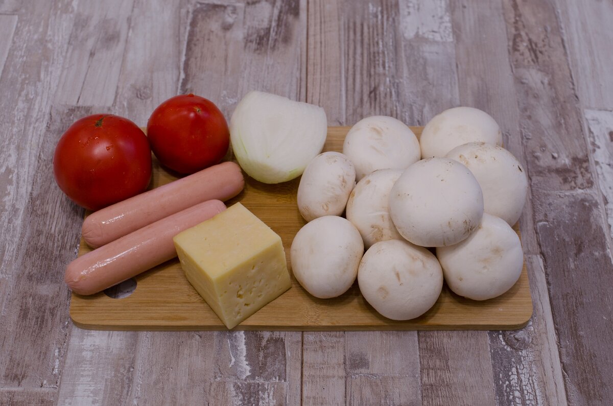Фаршированные шампиньоны - это простая и очень вкусная закуска, которая подойдет практически на любой случай: для праздничного стола, как повседневное блюдо, а так же идеально подходит для пикника на природе! А какой простор для фантазии - ведь начинок можно придумать великое множество (от самых простых до изысканных)! Так как на нашем канале мы рассказываем о простых и быстрых рецептах, сегодня делимся легким и бюджетным вариантом фаршировки. Приступим? :) Нам понадобится: Шампиньоны промываем, промакиваем лишнюю влагу бумажным полотенцем. При помощи чайной ложки удаляем ножки у грибов и складываем их в отдельную тару. Ножки грибов, помидоры, сосиски и лук нарезаем на небольшие кубики. Разогреваем в сковороде подсолнечное масло и обжариваем лук до полупрозрачного цвета. Добавляем помидоры, сосиски, ножки грибов. По желанию на этом этапе можно посолить и поперчить, но я этого не делаю, т.к. в сосисках и сыре и так уже содержится соль и ее для меня достаточно в этом блюде. Обжаривае