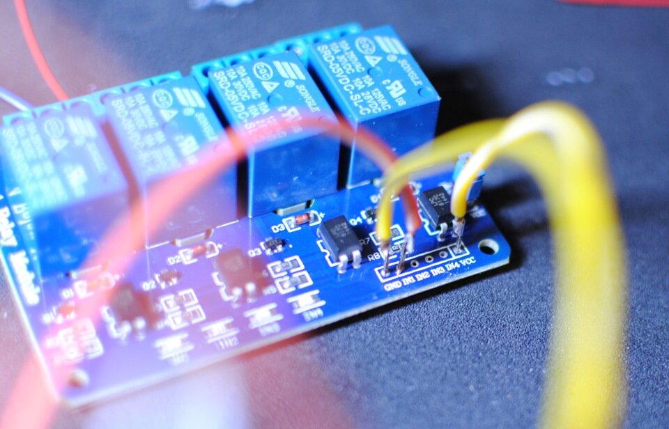 Для того чтобы убедиться что все работает можем загрузить в контроллер тестовый скетч "Blink". Открываем его "Файл"->"примеры"->"01.Basics"->"Blink". Загружаем на плату кнопкой "Файл"->"Загрузить", если внизу видим надпись "Загрузка выполнена" значит все гуд, перегружаем плату и видим моргающий светик на ней. Если видим красное поле и ошибки, то возвращаемся к п.1 и внимательно читаем статьи по установке и подключению контролера к ПК. - Подключаем модуль реле. В моем случаем это модуль из 4-х реле. Для теста я подключил всего одно реле на нем, пин "IN1". Итак, пин "VCC" модуля реле подключаем к "+5V" ардуины, GND к GND, пины IN1,2,3,4… к цифровым портам D2-D13. (в моем случае IN1 к порту D7)