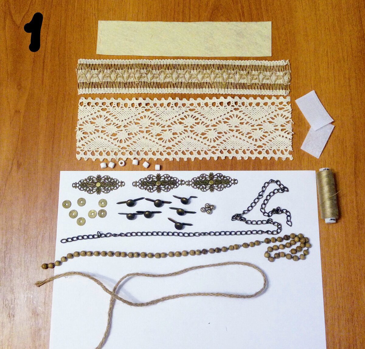 1. Для работы нам понадобятся: фетр бежевый, тесьма ажурная двух видов (широкая и поуже), нитки бежевые, лента-липучка 3 - 4см., деревянные и пластиковые бусины, декоративные монетки, цепочка, веревочка-бечевка, декоративные элементы и клепки под бронзу, клеевой пистолет.