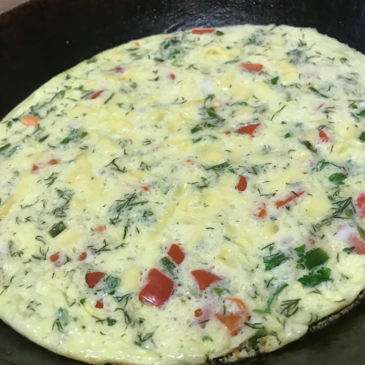 Разбиваем яйца, добавляем перец, зелень, соль и молоко, а затем хорошенько перемешиваем.